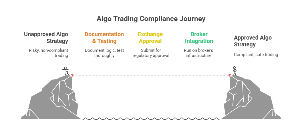 Before an algorithm goes live, the broker must get it approved by the exchange. Every strategy—white-box or black-box—must be documented, tested and certified, and any change in logic requires fresh approval. Each approved algorithm receives a Unique Algo ID, which is attached to every order so regulators can easily trace its activity.