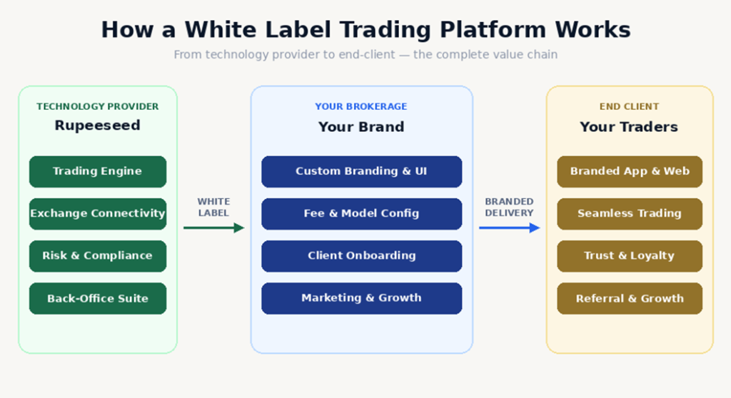 A white label trading platform is a fully-built, market-ready trading technology stack that a broker licenses and deploys under their own brand name. The technology provider — in this case, a white labelled trading platform provider like Rupeeseed Technology — handles the core engineering, exchange connectivity, compliance infrastructure, and ongoing system updates. The broker handles the client relationship, branding, and commercial strategy.